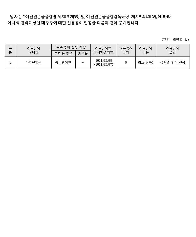 당사는 "여신전문금융업법 제50조제3항 및 여신전문금융업감독규정 제5조의4제2항"에 따라 이사회 결의대상인 대주주에 대한 신용공여 현황을 다음과 같이 첨부합니다.