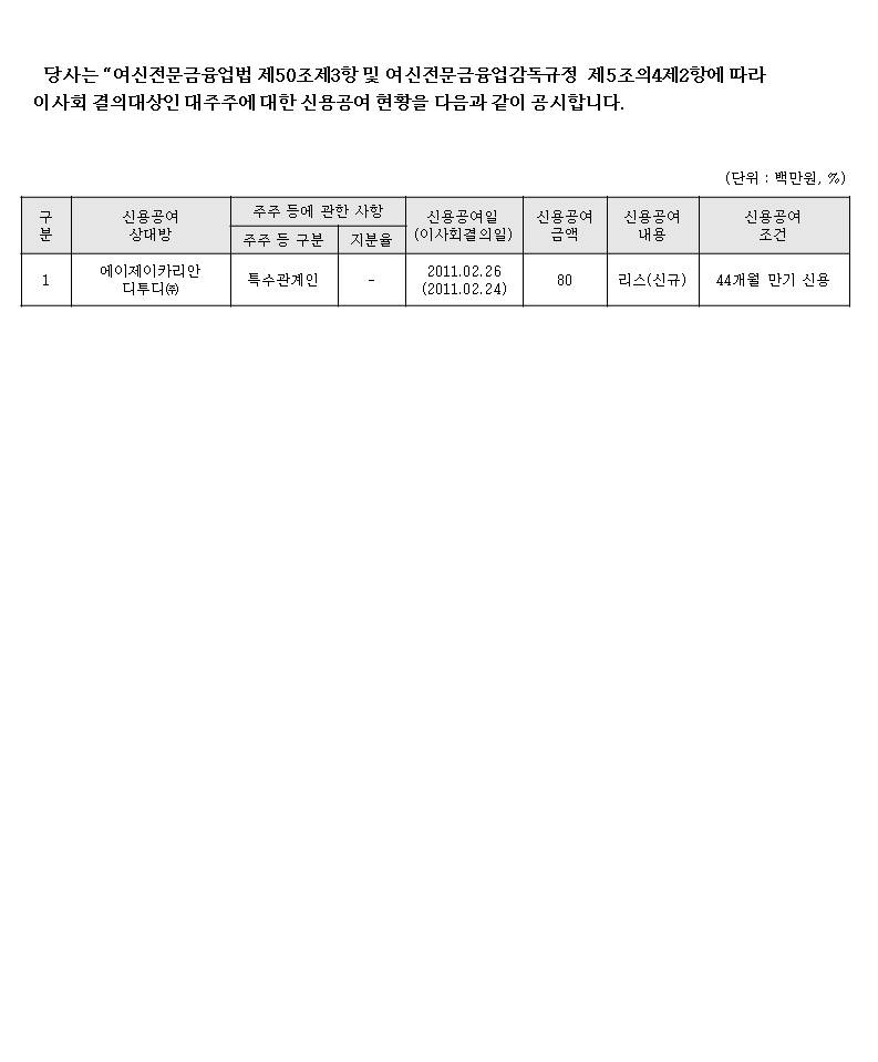 당사는 "여신전문금융업법 제50조제3항 및 여신전문금융업감독규정 제5조의4제2항"에 따라 이사회 결의대상인 대주주에 대한 신용공여 현황을 다음과 같이 첨부합니다.