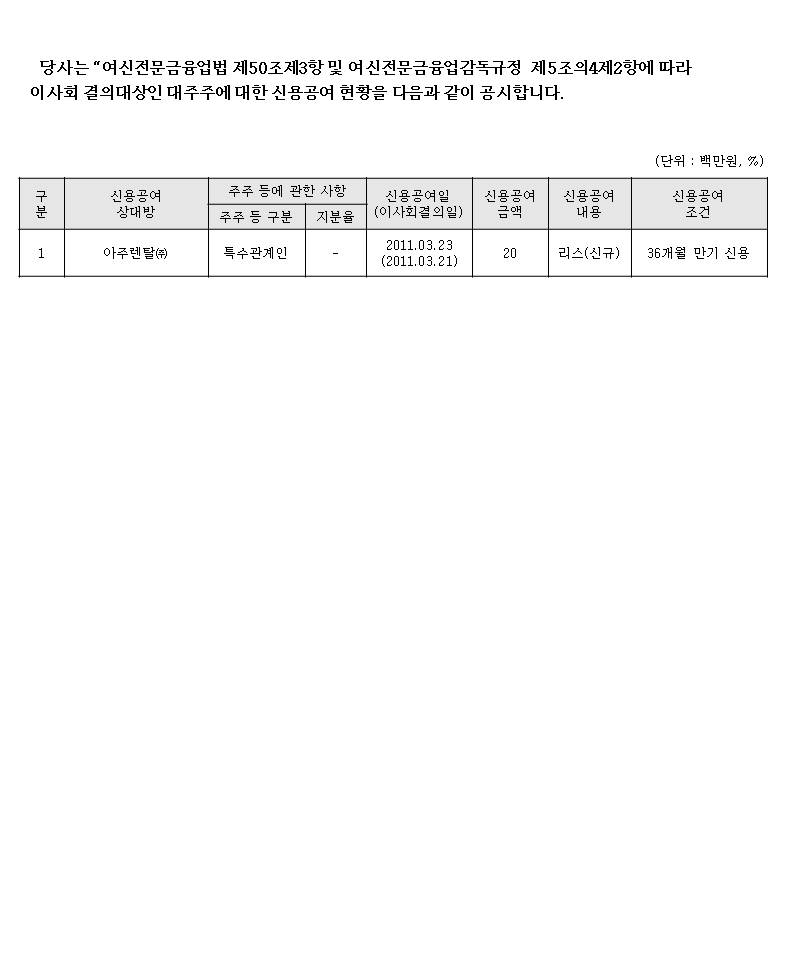 당사는 "여신전문금융업법 제50조제3항 및 여신전문금융업감독규정 제5조의4제2항"에 따라 이사회 결의대상인 대주주에 대한 신용공여 현황을 다음과 같이 첨부합니다.