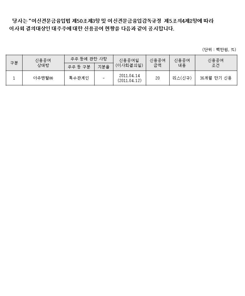 당사는 "여신전문금융업법 제50조제3항 및 여신전문금융업감독규정 제5조의4제2항"에 따라 이사회 결의대상인 대주주에 대한 신용공여 현황을 다음과 같이 첨부합니다.