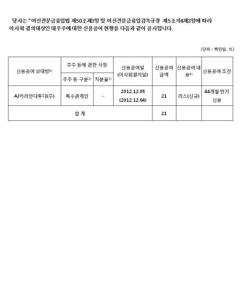 당사는 "여신전문금융업법 제50조제3항 및 여신전문금융업감독규정 제5조의4제2항"에 따라 이사회 결의대상인 대주주에 대한 신용공여 현황을 다음과 같이 첨부합니다.