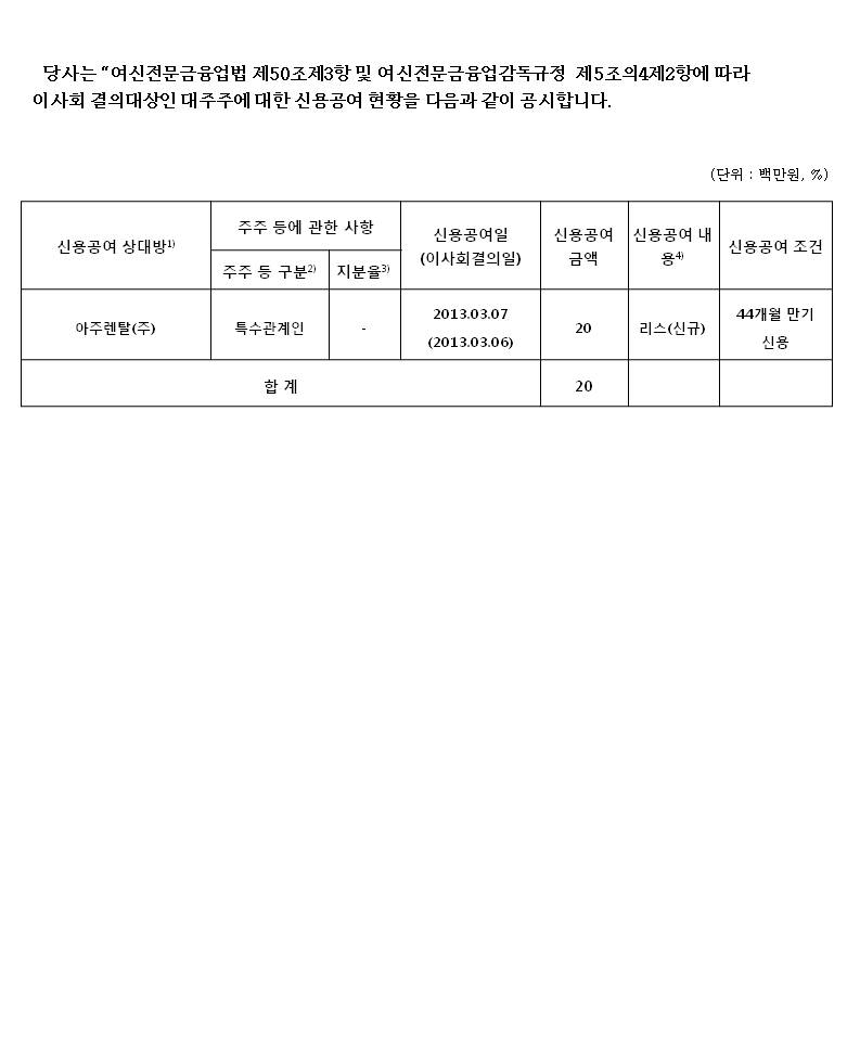 당사는 "여신전문금융업법 제50조제3항 및 여신전문금융업감독규정 제5조의4제2항"에 따라 이사회 결의대상인 대주주에 대한 신용공여 현황을 다음과 같이 첨부합니다.
