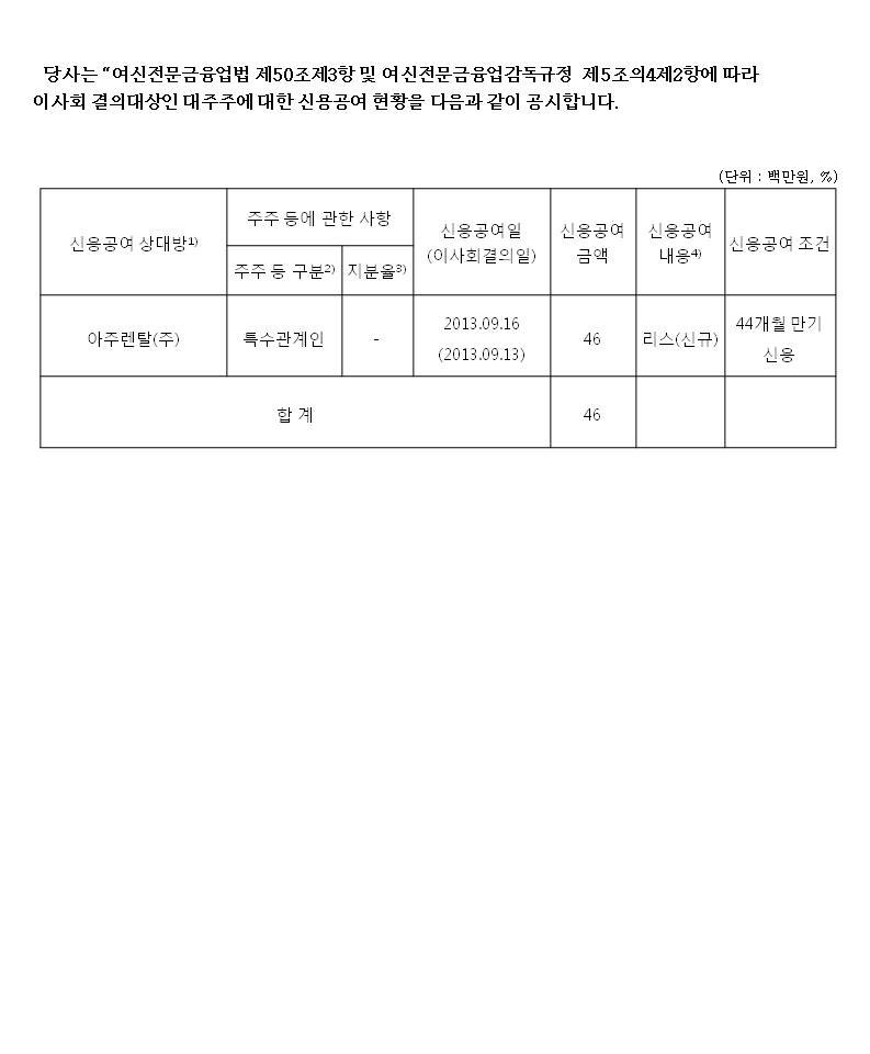 이사회 결의대상 대주주 신용공여 현황(13.09.16)