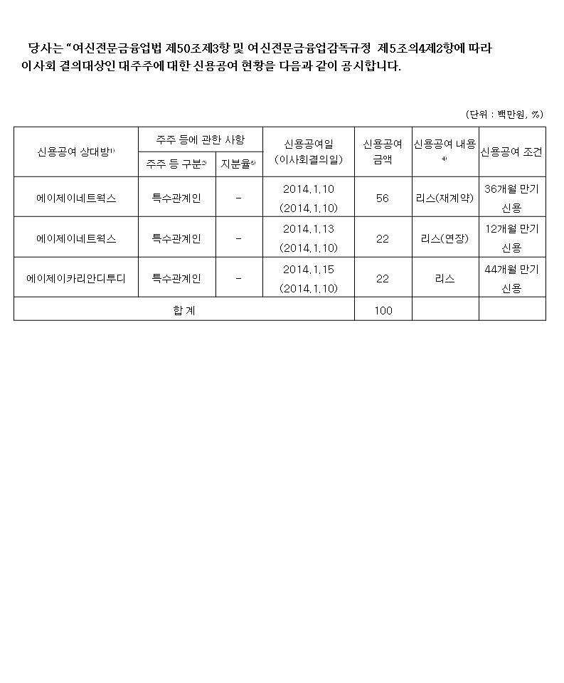 당사는 "여신전문금융업법 제50조제3항 및 여신전문금융업감독규정 제5조의4제2항"에 따라 이사회 결의대상인 대주주에 대한 신용공여 현황을 다음과 같이 첨부합니다.