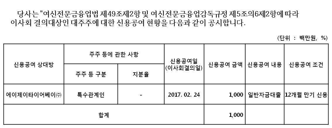 당사는 "여신전문금융업법 제50조제3항 및 여신전문금융업감독규정 제5조의4제2항"에 따라 이사회 결의대상인 대주주에 대한 신용공여 현황을 다음과 같이 첨부합니다.