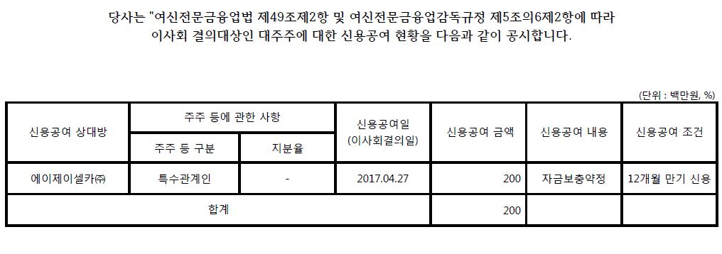 당사는 "여신전문금융업법 제50조제3항 및 여신전문금융업감독규정 제5조의4제2항"에 따라 이사회 결의대상인 대주주에 대한 신용공여 현황을 다음과 같이 첨부합니다.