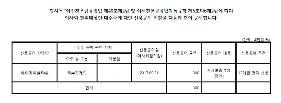 당사는 "여신전문금융업법 제50조제3항 및 여신전문금융업감독규정 제5조의4제2항"에 따라 이사회 결의대상인 대주주에 대한 신용공여 현황을 다음과 같이 첨부합니다.