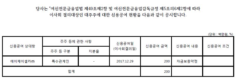 당사는 "여신전문금융업법 제49조2제3항 및 여신전문금융업감독규정 제5조의6제2항"에 따라 이사회 결의대상인 대주주에 대한 신용공여 현황을 다음과 같이 첨부합니다.