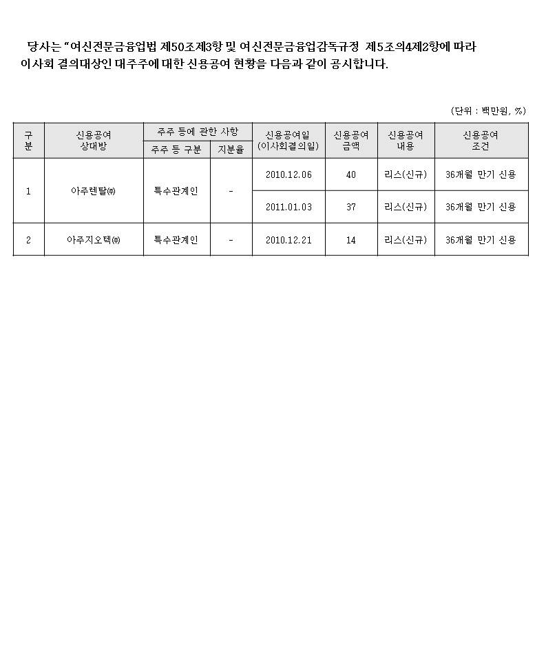 당사는 "여신전문금융업법 제50조제3항 및 여신전문금융업감독규정 제5조의4제2항"에 따라 이사회 결의대상인 대주주에 대한 신용공여 현황을 다음과 같이 첨부합니다.